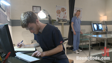 Late into the hospitals night shift, orderly Seamus OReilly takes a new hire, Rob Yaeger, through the normal routine. Rob, already bored with the nights tasks, starts feeling horny at the sight of all the pumps and probes. He checks out Seamus, rubbing his cock through his scrubs and asking if they are the only ones around. Seamus nonchalantly replies that no one else will be around for the rest of the shift, unaware of Robs intentions. Rob pounces on Seamus, strapping him down to an operating table and pinching his body all over in clothespins. Rob inspects Seamus gigantic cock, running a sharp and painful Wartenberg wheel up the tender shaft to test Seamus reflexes. Satisfied with Seamus hard-on in reaction to the exam so far, Rob decides to focus on his own cock, ramming it into Seamus gaped mouth, pried open with a spider gag. Rob slaps the clothespins off Seamus as he screams at the top of his lungs and moves him to an exam chair for an anal inspection. Seamus is made to take a succession of large butt plugs before Rob inserts his fist as far as hes able. Next, Rob straps Seamus to another exam chair with the subs legs spread apart in the stirrups as his vulnerable feet are caned again and again. After ramming his cock up the boys ass Seamus has his cock milked of all the cum before having it shoved in his mouth. Prying the boys mouth open, Rob shoots a load right into Seamus mouth before leaving him for the doctors to find.